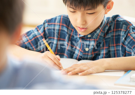 一心に書き込む小学生の男の子|勉強に没頭する真剣な表情