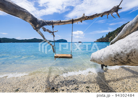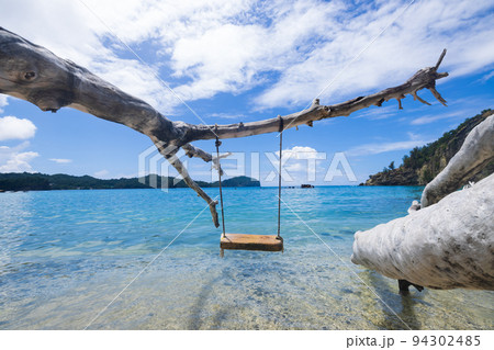 ブランコに乗る子供と境浦海岸の風景(父島)