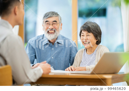シニア、営業、相談、母親、息子、笑顔、コピースペース、笑う、資産運用、説明、保険、相続税、財産