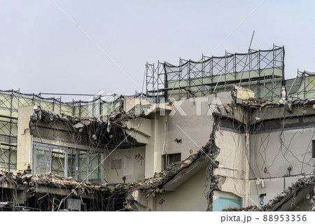 解体工事現場 コンクリートの壁面と鉄筋くず