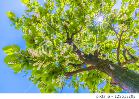 日本の横浜都市景観 緑と白が映えるハクウンボク(白雲木)…。花言葉は壮大、愛の旅、朗らかな人=27日