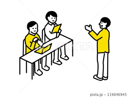 説明をする人と、机に座って聞く2人のイラスト