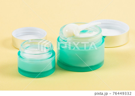 White cream in a blue jar on a yellow background. Cosmetic product for skin care.