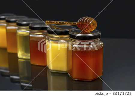 Hexagonal jars with different types and colors of fresh flower honey and a honey spoon.