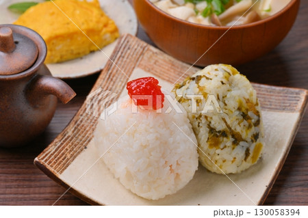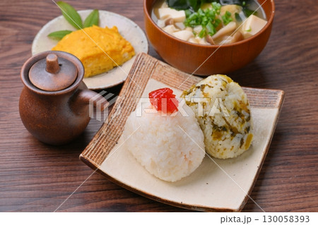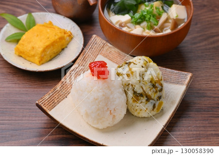 おにぎり(紅子と高菜)定食。味噌汁とだし巻き玉子。