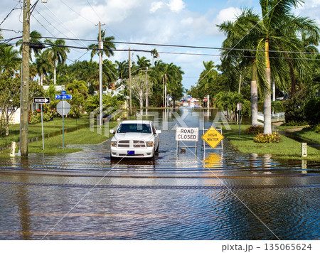 Hurricane Milton aftermath in Punta Gorda, Florida. City street closed because of flooding with warning signs blocking driving of cars