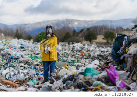 Activist standing on landfill, on large pile of waste with dark clouds above. Environmental concept and eco activism.