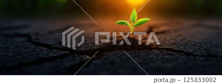 Green Seedling Emerging from Dry Cracked Soil Under Bright Sunlight at Dawn