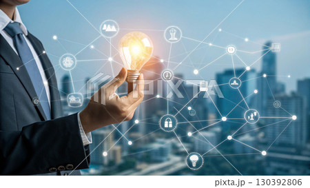 A businessman holds a glowing light bulb symbolizing innovation and new ideas, connected to a digital network representing technology and business solutions