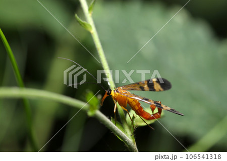 交尾器を上げるベッコウシリアゲのオス(マクロレンズ使用・ストロボ+自然光・接写写真)