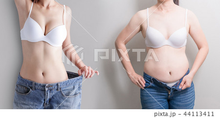 Fat woman has lost weight and acquired beautiful figure thanks to liposuction or regular fitness