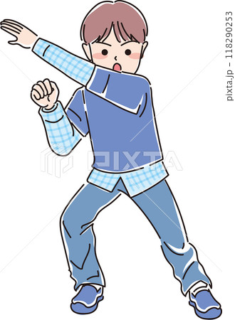 男の子の表情_手を斜めに上げてポーズを決める_全身