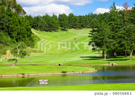 青空のゴルフ場・打ち下ろし、ハザードの池に囲まれた浮島グリーンの後ろから(千葉県木更津市)