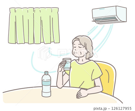 エアコンの効いた室内で水分補給するシニア女性のイラスト