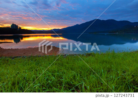 日月潭風景,美麗的湖面景觀映照出奇幻的日出天空。亞洲台灣南投著名的旅遊景點。