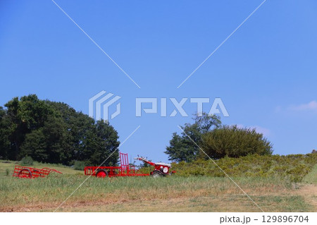 青空と草原の丘に停まる赤い農耕車の里山風景