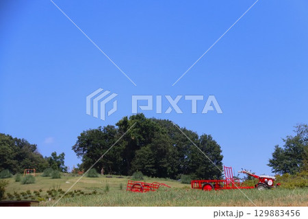 青空と丘の上に置かれた赤い農耕車の里山風景
