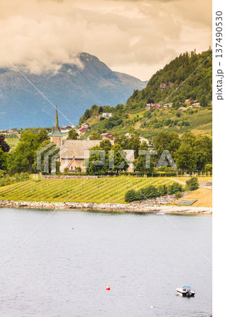 Mountains and fjord with village Norway.