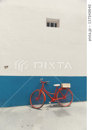 Red vintage bicycle parked against blue and white minimalist wall with vast copy space