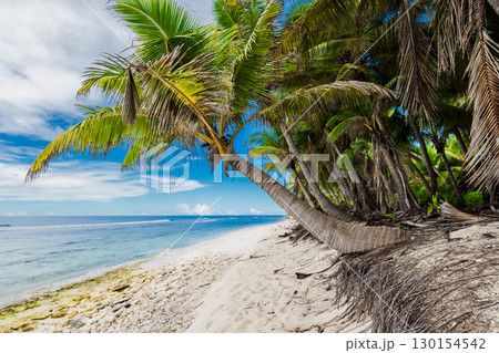 Tropical beach with leaning palm tree, white sand and turquoise ocean under blue sky