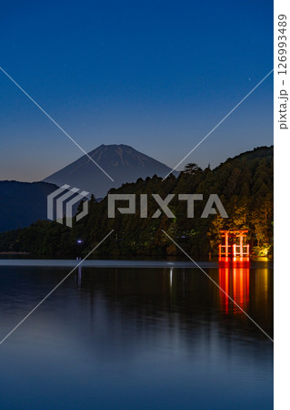(神奈川県)元箱根湖畔から望む富士山 夕景