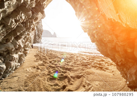 sunset seascape, captured from a rocky volcanic cave, view of the beach, sand, pebbles, and volcanic basalt formations, illuminated by the warm glow of the sun.