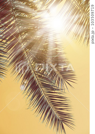 Sun rays through the palm tree leaves background. Summer sunset scenery. Holidays and summertime background.