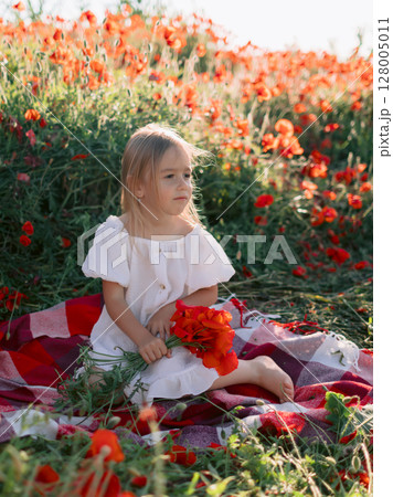 Little girl in a white on a red plaid in a poppy field, holding flowers and enjoying a sunny summer day