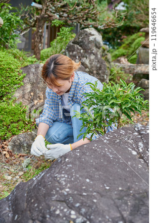 庭の手入れをする女性 日本庭園 田舎 空き家 草抜き