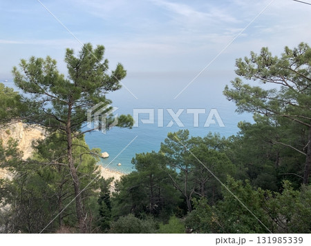 Abandoned scenic old road along the sea and cliffs, view from above from the cliff through the trees