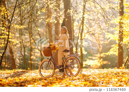 Stylish woman with a bicycle enjoying autumn weather in the park. Beautiful Woman in the autumn forest.