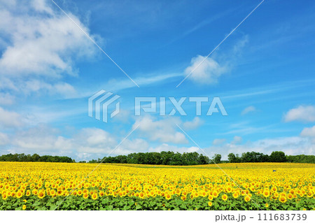 北海道 夏の青空とひまわりの風景