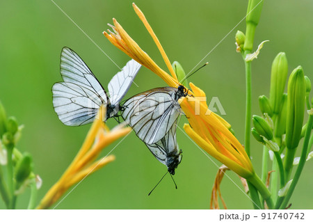 初夏の北海道の原生花園で見られる白いエレガントなエゾシロチョウの求愛