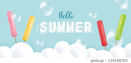夏天水果冰棒與透明泡泡,夏季銷售海報橫幅廣告宣傳單向量素材圖片