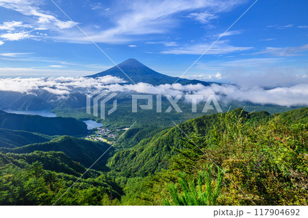 御坂山地の精進山展望台より 子抱き富士と晴れ行く精進湖の眺望