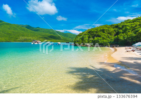beautiful landscape with white sandy beach in blue lagoon of the sea on tropical paradise island in Asian resort in summer