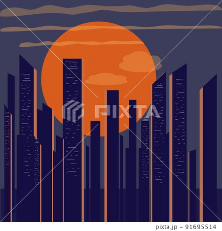Night city illustration in old retro 70 style. Sunset in big city concept for print.