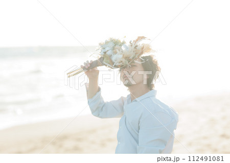 海辺に佇む白シャツを着た30代男性