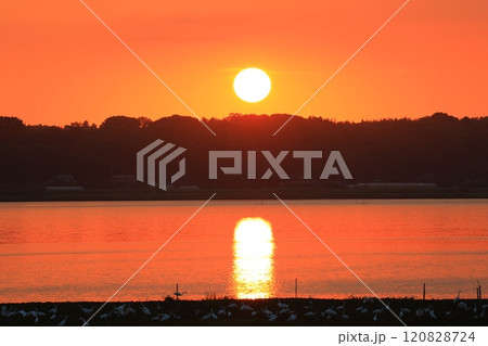 水面に映る朝焼けの空