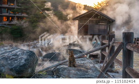 Yawning cat in mount Unzen Hell valley Jigoku at sunset, Nagasaki