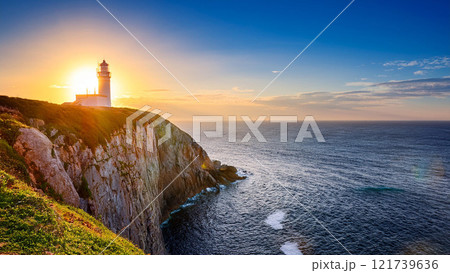 Majestic Lighthouse Standing Tall Against a Vibrant Sunset, Illuminating the Calm Coastal Waters