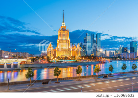 Illuminated high-rise stalinist building near river at summer night in Moscow, Russia. Historic name is Hotel Ukraina.