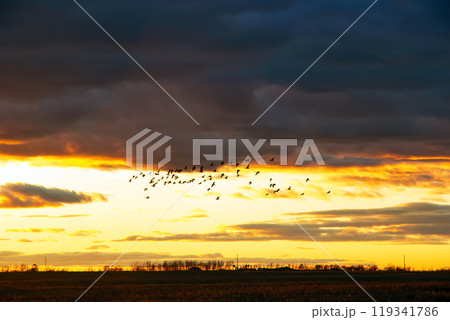 Bright beautiful sunrise with orange and purple light along the highway and silhouettes of a grain bins at the farm in the horizon in autumn.