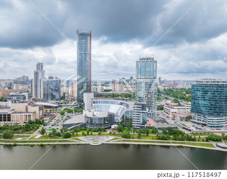 Yekaterinburg city with Buildings of Regional Government and Parliament, Dramatic Theatre, Iset Tower, Yeltsin Center, panoramic view at summer sunset.