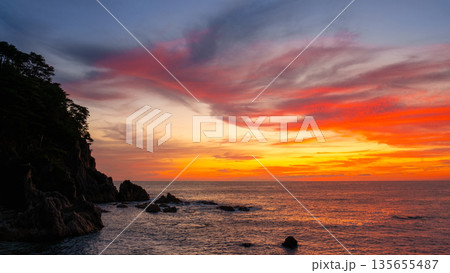 角田岬の夕暮れ:佐渡島に沈む夕日