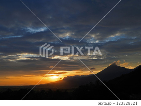 オレンジ色に輝く太陽と波状の雲、それにシルエットの磐梯山が印象的で綺麗だ。
