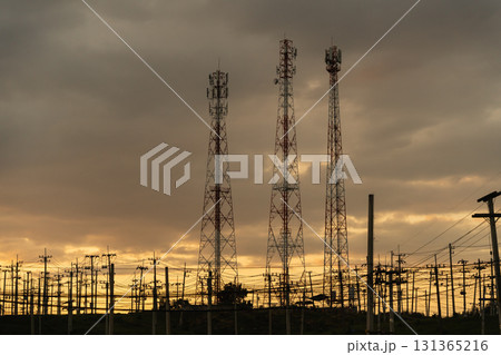 Communication Towers Silhouetted Against Dramatic Sunset Sky with Clouds and Power Lines in Background