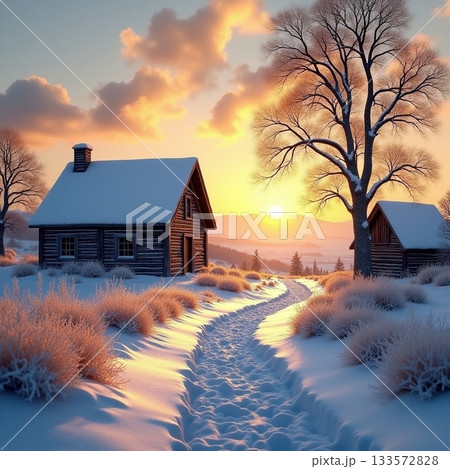 Cozy winter evening with warm sunlight over snowy landscape Generative AI