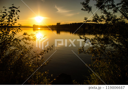 Big lake with green shores in bright sun light and city on horizon, aerial landscape. Recreation concept. Aerial view
