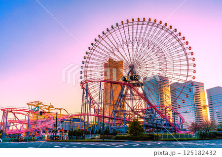 日本の横浜都市景観4月・夕日に映える桜木町駅の大観覧車や横浜ランドマークタワーなどを望む